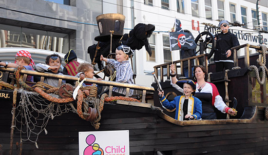 16日,在新西蘭首都惠靈頓,參加游行的“海盜”花車駛過(guò)街頭。當(dāng)天,惠靈頓市政府舉辦一年一度的圣誕大巡游活動(dòng),當(dāng)?shù)孛癖娂娂娪可辖诸^,享受明媚陽(yáng)光,感受圣誕氣氛。