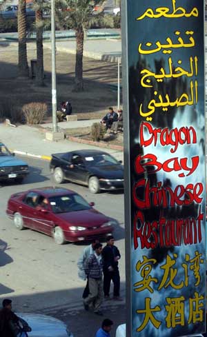 該圖為2003年12月31日開業(yè)的宴龍灣大酒店的標(biāo)牌。建立在巴格達(dá)市中心的該酒店是伊拉克戰(zhàn)后首家中國人投資的中餐飯店。新華社記者:黃敬文