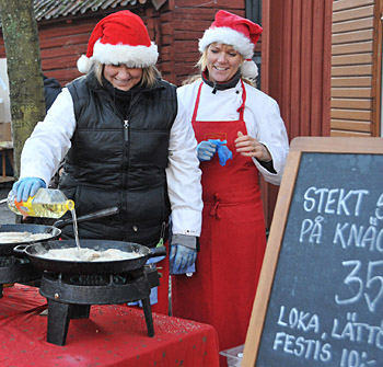 21日,在瑞典首都斯德哥爾摩附近的小鎮(zhèn)錫格蒂納,兩位婦女在圣誕節(jié)露天市場上制作當?shù)仫L味小吃。瑞典各地都有在圣誕節(jié)前夕開設露天市場的傳統(tǒng)。在這種露天圣誕節(jié)市場上,居民不僅可以買到圣誕節(jié)商品,而且還能品嘗到當?shù)仫L味小吃,節(jié)日氣氛非常濃郁。