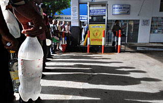 在斯里蘭卡首都科倫坡,人們手持各種容器在加油站排隊(duì)買汽油。新華社發(fā) |