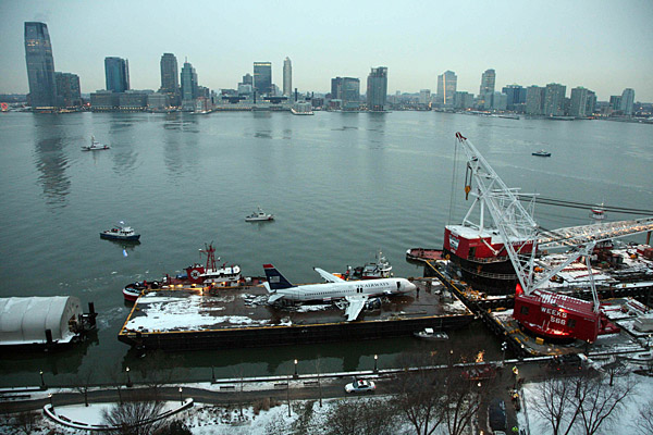 18日,在美國紐約,被打撈出哈得孫河的全美航空公司1549號航班客機(jī)在岸邊等待運(yùn)輸,它將被運(yùn)往新澤西州進(jìn)行進(jìn)一步的檢查。該客機(jī)15日下午因飛鳥撞擊導(dǎo)致引擎故障,墜入紐約哈得孫河。因機(jī)長沉著應(yīng)對和紐約應(yīng)急救援部門的快速反應(yīng),150名乘客以及5名機(jī)組人員全部獲救。新華社/路透