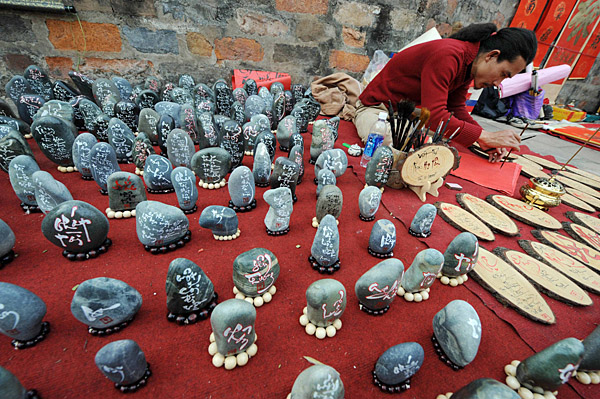 19日,一位書(shū)法家在越南首都河內(nèi)一寺廟外繪制春節(jié)裝飾品。與中國(guó)類(lèi)似,春節(jié)在越南也是一年中最重要的節(jié)日。新華社/法新
