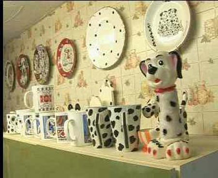 受到多迪·史密斯的小說《101斑點(diǎn)狗》及其相關(guān)電影和動(dòng)畫片的影響,英國人卡倫·費(fèi)里爾成為斑點(diǎn)狗極其相關(guān)產(chǎn)品的狂熱愛好者,F(xiàn)在,她已經(jīng)是全英國有關(guān)“斑點(diǎn)狗”收藏品數(shù)量最多、種類最全的人。 更為有意思的是,自從卡倫·費(fèi)里爾在1991年買了一條名叫迪托的斑點(diǎn)狗后,她喜愛的范圍就不再局限于斑點(diǎn)狗了,所有和斑點(diǎn)有關(guān)的物品都是她收藏的對(duì)象。 現(xiàn)在,卡倫·費(fèi)里爾決定將她收集的這些與斑點(diǎn)有關(guān)的物品全部賣掉,目的是希望能夠和與她有相同愛好的人共同分享這些藏品。 一座位于南安普敦的普通房屋是卡倫·費(fèi)里爾收藏斑點(diǎn)狗的樂園。門口有一輛斑點(diǎn)汽車,走進(jìn)屋內(nèi),人們仿佛置身于斑點(diǎn)的世界。這里共有大約5000多件和斑點(diǎn)有關(guān)的收藏品,包括斑點(diǎn)臺(tái)燈、斑點(diǎn)氣球、斑點(diǎn)冰鞋、斑點(diǎn)餐具等。 44歲的卡倫·費(fèi)里爾花了17年的時(shí)間收集到這些藏品,其中既有上世紀(jì)50年代的原裝玩具,也有電影《101斑點(diǎn)狗》的配套產(chǎn)品?▊惖恼煞蚯兴箤(duì)于妻子的愛好也十分理解。 在拍賣藏品的消息傳出后,很多和卡倫·費(fèi)里爾有相同愛好的人都趕來,希望能夠分享這些收藏品?▊悺べM(fèi)里爾表示,她的每一件藏品都包含著一段美好的故事,她非常希望購買收藏品的人能把這些故事一起帶回家。