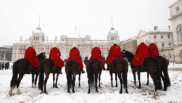 2日,在英國(guó)倫敦,英國(guó)皇家騎兵團(tuán)成員在風(fēng)雪中佇立。行業(yè)協(xié)會(huì)3日公布的一份調(diào)查數(shù)據(jù)顯示,1日晚起出現(xiàn)的連續(xù)降雪給英國(guó)造成的經(jīng)濟(jì)損失可能超過(guò)10億美元。如果降雪持續(xù),這一數(shù)字可能繼續(xù)上升,使本已陷入衰退的英國(guó)經(jīng)濟(jì)雪上加霜。新華社/路透 | |