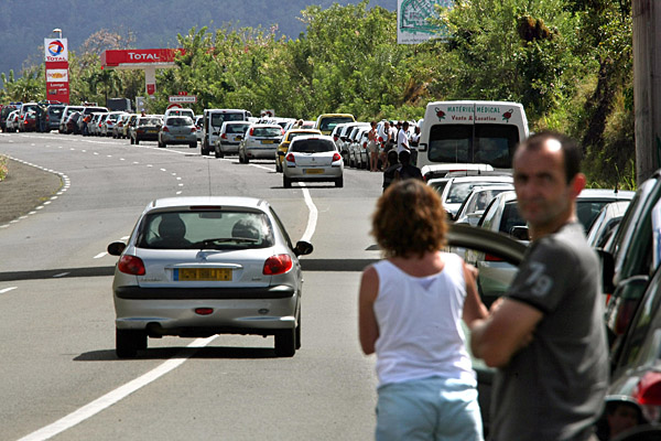 14日,在法屬馬提尼克島,等候加油的車(chē)輛排成長(zhǎng)隊(duì)。加勒比海地區(qū)的瓜德魯普、馬提尼克等法國(guó)海外領(lǐng)地上月以來(lái)發(fā)生罷工和示威游行,抗議物價(jià)上漲并要求增加工資,近日事態(tài)已經(jīng)升級(jí)并發(fā)生騷亂,許多商店和加油站關(guān)門(mén)。法國(guó)已從本土派遣防暴警察赴這兩個(gè)海外領(lǐng)地維持秩序。新華社/法新 | |