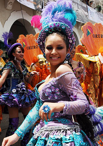21日,在玻利維亞西南部奧魯羅省首府奧魯羅市街頭,姑娘們身著艷麗服裝參加狂歡節(jié)表演。著名的玻利維亞奧魯羅狂歡節(jié)是南美地區(qū)最具特色的狂歡節(jié)之一,每年都吸引數十萬人前來觀看。新華社發(fā)