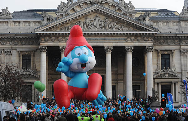 2月28日,藍精靈形象的氣球行進在比利時布魯塞爾的氣球大游行隊伍中。當天,布魯塞爾首次舉行氣球大游行,氣球形狀以各種著名的動漫人物為主。游行同時拉開了2009布魯塞爾動漫年的序幕。