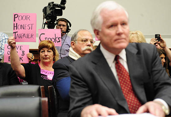 圖為18日AIG首席執(zhí)行官愛德華·利迪(前)在美國國會山出席國會眾議院金融委員會舉行的聽證會,抗議者在其身后高舉標語。