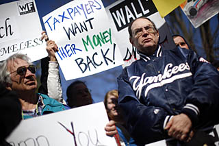 21日,在美國(guó)康涅狄格州美國(guó)國(guó)際集團(tuán)(AIG)總部外,抗議者手舉“納稅人想要回他們的錢”等牌板。當(dāng)天,康涅狄格州一個(gè)勞工團(tuán)體組織金融危機(jī)受害者前往AIG總部,抗議AIG在接受美國(guó)政府巨額資金援助的情況下仍向部分高管和員工發(fā)放高額獎(jiǎng)金。新華社/路透 | 美國(guó)康涅狄格州總檢察長(zhǎng)理查德·布盧門塔爾21日說(shuō),保險(xiǎn)業(yè)巨頭美國(guó)國(guó)際集團(tuán)(AIG)提交文件顯示,公司前一周(指9日至15日)共發(fā)放2.18億美元獎(jiǎng)金,比先前公布數(shù)額多5300萬(wàn)美元。他要求公司作出解釋。 AIG發(fā)放巨額獎(jiǎng)金一事引發(fā)眾怒,美國(guó)19州宣布展開(kāi)聯(lián)合調(diào)查。但白宮發(fā)言人說(shuō),總統(tǒng)貝拉克·奧巴馬可能會(huì)在獎(jiǎng)金征收重稅問(wèn)題上態(tài)度有所緩和,以確保相關(guān)公司不會(huì)退出政府金融業(yè)救助計(jì)劃。