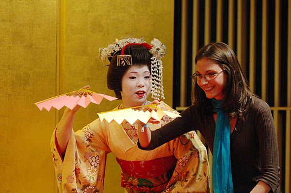 21日,一名外國游客在東京與藝妓進行一項傳統(tǒng)日本游戲。日本政府日前提出要在2020年前后將赴日外國游客增至2千萬的目標(biāo),其中傳統(tǒng)藝術(shù)和獨特的飲食文化將是宣傳重點。
