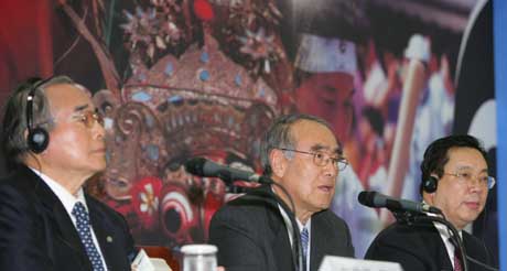 12日,韓國前總理李洪九(中)在韓國釜山舉辦的第四次“東北亞名人會”開幕式上做主旨發(fā)言。中國新華通訊社副社長周錫生(右)、日本經(jīng)濟(jì)新聞社社長杉田亮毅(左)出席開幕式