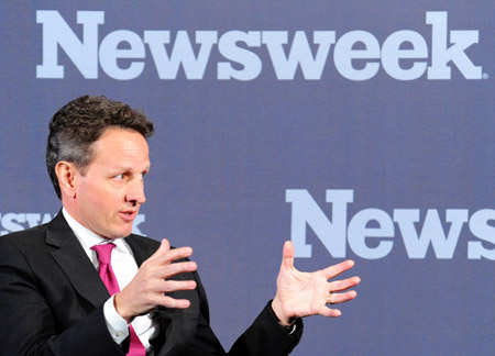 18日,在美國(guó)華盛頓,美國(guó)財(cái)政部長(zhǎng)蓋特納在《新聞周刊》雜志舉辦的午餐會(huì)上發(fā)表講話。蓋特納當(dāng)天表示,美國(guó)經(jīng)濟(jì)正趨于穩(wěn)定,但失業(yè)率仍將繼續(xù)上升。新華社/法新 |