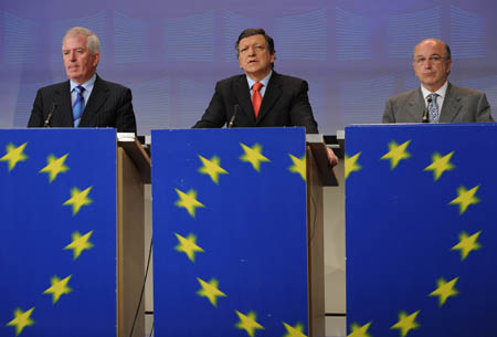5月27日,歐盟委員會(huì)主席巴羅佐(中)、歐盟委員會(huì)負(fù)責(zé)經(jīng)濟(jì)和貨幣事務(wù)的委員阿爾穆尼亞(右)和負(fù)責(zé)內(nèi)部市場(chǎng)和服務(wù)業(yè)的委員麥克里維在比利時(shí)首都布魯塞爾的歐盟總部出席新聞發(fā)布會(huì),公布?xì)W盟金融監(jiān)管的改革方案。當(dāng)天,歐盟委員會(huì)出臺(tái)改革方案,試圖設(shè)立一套泛歐金融監(jiān)管體系,加強(qiáng)歐盟層面上的金融監(jiān)管,改變目前各成員國條塊分割的局面。新華社記者:武巍 攝 |