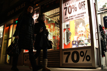美國聯(lián)邦儲(chǔ)備委員會(huì)3月發(fā)表報(bào)告說,自今年初以來美國經(jīng)濟(jì)總體仍持續(xù)惡化,短時(shí)間內(nèi)難以好轉(zhuǎn),到2009年底或2010年初才可能出現(xiàn)明顯復(fù)蘇。行人從美國紐約一家商店的打折廣告旁走過。新華社記者劉欣