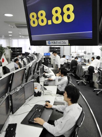 28日,一名交易員在東京外匯交易市場的外匯電子牌價下工作。(資料照片) | 28日東京外匯市場,日元對美元匯率沖破90比1的關(guān)口,一度升至88.23比1的附近,創(chuàng)下自今年1月23日之后約8個月的盤中新高。在不到一個半月的時間里升值近10日元,從8月上半月時的97升至目前的水平。 為此,日本財務(wù)大臣藤井裕久29日上午對新聞界說,近日東京外匯市場上日元對美元升值速度“稍微有些快”,如果日元匯率發(fā)生“急劇變動”,政府必須考慮采取對策。 藤井裕久認為,日元匯率變動的主要原因在于美國經(jīng)濟形勢。他表示,如果發(fā)生“異常事態(tài)”,將存在各種可能性。這一表態(tài)顯示日本政府在是否干預(yù)市場政策上有所調(diào)整。上周,藤井曾暗示政府不打算干預(yù)市場。 29日東京時間上午10時,東京外匯市場上日元對美元匯率回落至90.2比1水平。市場人士指出,一些機構(gòu)投資者開始購買美元,從而遏制了日元快速升值的勢頭。