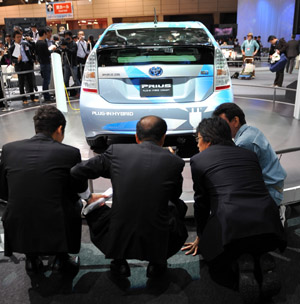豐田汽車公司員工在日本東京車展上一輛展出的新型混合動(dòng)力車后交談。新華社/法新 |