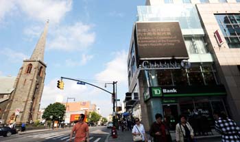 9月18日,在美國(guó)紐約,電子屏幕上顯示“慶祝中華人民共和國(guó)成立六十周年圖片展”。新華社記者 谷欣容