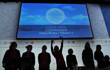 12月15日,在丹麥?zhǔn)锥几绫竟ぷ魅藛T在聯(lián)合國氣候變化大會高層會議的開幕式上站在大屏幕前。當(dāng)天,氣候變化大會開始進(jìn)入更加關(guān)鍵的高層會議。爭取在本周的會期內(nèi)就應(yīng)對氣候變化達(dá)成協(xié)議。新華社記者