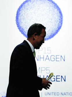 聯(lián)合國(guó)秘書長(zhǎng)潘基文19日說(shuō),在哥本哈根舉行的聯(lián)合國(guó)氣候變化大會(huì)朝著正確的方向邁出了一步。新華社記者 曾毅 攝 |