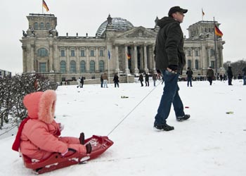 1月2日,在德國(guó)首都柏林,一名男子帶著孩子在雪地中玩耍。天氣預(yù)報(bào)稱,未來(lái)幾天德國(guó)將繼續(xù)降雪。新華社/法新 |