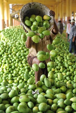 一名工人在印度海德拉巴附近的一個水果市場倒芒果。印度盛產(chǎn)芒果,這里每年出產(chǎn)的芒果接近世界總產(chǎn)量的一半。新華社/法新 |