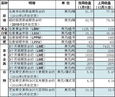 2010年第一周,國際大宗商品價(jià)格延續(xù)2009年最后一周上漲態(tài)勢。以油價(jià)和銅價(jià)漲勢最為明顯。 6日,美元對歐元、英鎊等主要貨幣匯率走低,抵消了美國原油商業(yè)庫存意外增加的影響,國際油價(jià)繼續(xù)上揚(yáng),紐約商品交易所一舉突破每桶83美元。截至當(dāng)日,國際油價(jià)已連續(xù)十個交易日上行,累計(jì)漲幅達(dá)14%,是1996年以來最長單邊上漲行情。 不過,美元對西方主要貨幣的比價(jià)7日上升,令以美元計(jì)價(jià)的原油期貨承壓,紐約、倫敦兩地油價(jià)當(dāng)天雙雙回落。截至8日收盤時,紐約商品交易所2月份交貨的輕質(zhì)原油期貨價(jià)格,收于每桶82.75美元;倫敦北海布倫特原油期貨價(jià)格下跌38美分,收于每桶81.37美元。另外,雖然美國寒冷天氣仍在繼續(xù),但最新出臺的燃油商業(yè)庫存報(bào)告顯示各種油品供應(yīng)充足,原油庫存意外大幅上升,也使得油價(jià)缺乏上漲動力! 當(dāng)周國際金價(jià)持續(xù)上漲,倫敦黃金市場價(jià)格當(dāng)周收盤價(jià)每盎司為1126.75美元,受印度央行大舉采購黃金和圣誕節(jié)、春節(jié)到來拉動消費(fèi)的影響,國際金價(jià)出現(xiàn)快速上漲。 受智利銅礦工人罷工事件的影響,倫敦金屬交易所(LME)3個月期銅價(jià)格在周四(7日)一度飆升至7796美元/噸,這是自2008年8月以來最高水平。隨著全球經(jīng)濟(jì)回暖和中國銅需求的增加,銅價(jià)自2009年年初以來漲幅超過130%。 6日,紐約原油價(jià)格大幅走高,為玉米、小麥的上漲提供了利好的外部市場基調(diào)。分析人士稱,有關(guān)商品基金將調(diào)整持倉頭寸的預(yù)期推動小麥價(jià)格上漲。美國商品期貨交易委員會持倉報(bào)告顯示,此前投機(jī)性基金持有大量小麥凈空頭頭寸。 在美國大豆收割結(jié)束后,南美大豆生長狀況成為市場關(guān)注的重點(diǎn)。氣象預(yù)報(bào)顯示,近期巴西、阿根廷的天氣有利于大豆生長,從而為芝加哥期貨交易所(CBOT)大豆價(jià)格走勢帶來壓力。