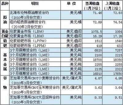 由于市場對中國有可能收緊貨幣政策的持續(xù)擔憂以及對世界宏觀經(jīng)濟的謹慎展望,當周多數(shù)大宗商品延續(xù)前一周跌勢。 國際油價當周繼續(xù)下跌,主要受美元走強等因素影響,美元對歐元匯率創(chuàng)6個月來新高。美國商務部1月29日發(fā)布報告說,2009年第4季度美國經(jīng)濟增長5.7%,連續(xù)第2個季度增長。該數(shù)據(jù)強化了市場有關(guān)美國經(jīng)濟將比其他發(fā)達國家更快復蘇的觀點,致使美元走強、油價下跌。另外,投資者對原油需求前景仍然存在疑慮,也對油價形成打壓。英國石油公司首席執(zhí)行官托尼·海沃德1月28日在達沃斯預測,今年石油價格將維持在每桶60美元至80美元之間。 當周美元走強和市場對稀有金屬價格繼續(xù)回落,國際金價已跌破每盎司1100美元。有報道援引興業(yè)銀行研究處資深黃金分析師蔣舒博士的話說,進入新年以來,全球經(jīng)濟形勢仍不明朗,一些主要經(jīng)濟體尤其是美國公布的重要經(jīng)濟數(shù)據(jù)直接影響了金價走勢。除鎳價有所上升之外,倫敦金屬交易市場其他基本金屬3個月期貨價格當周都在下跌,其中銅價降幅最大。 在觸及3個多月來低點后,芝加哥期貨交易所(CBOT)農(nóng)產(chǎn)品期貨28日小幅反彈。南美作物產(chǎn)量巨大繼續(xù)為市場帶來壓力。