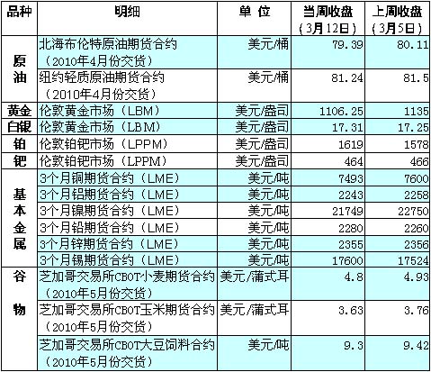 國際油價在當周大宗商品價格變化中最為引人注目,11日震蕩上升越過82美元/桶后于12日小幅回落。11日收盤時,紐約商品交易所4月份交貨的輕質(zhì)原油期貨價格上漲2美分,收于每桶82.11美元,連續(xù)第二天突破82美元,當日倫敦市場北海布倫特原油期貨價格下跌20美分,收于每桶80.28美元。 分析人士指出,國際油價當周的上升主要是受到投資者對需求的擔(dān)憂、美元走勢以及全球經(jīng)濟復(fù)蘇的預(yù)期等因素的影響。中國2月強勁的出口經(jīng)濟數(shù)據(jù)對市場也起了推升作用。 12日油價小幅回落主要受到美國消費者信心指數(shù)和國際能源機構(gòu)對國際原油消費預(yù)期的影響,密歇根大學(xué)與路透社公布的報告顯示,美國消費者信心指數(shù)從2月份的73.6降至3月份的72.5。國際能源機構(gòu)調(diào)高了對今年國際原油需求的預(yù)期。該組織預(yù)計,今年世界原油日消費量有望增加7萬桶,達到8657萬桶。 國際金價8日自高點下滑。歐元兌美元走跌、2月份美國商品零售額意外增長和投資者對希臘債務(wù)危機憂慮減緩等因素對金價走低起到了推動作用。當周貴金屬中,鈀價變化最為顯著,摸至近2年來的新高點,達到480美元/盎司。鈀價飆升主要是因中國汽車銷售數(shù)據(jù)表現(xiàn)強勁。 受市場擔(dān)憂中國對銅需求下降以及龐大市場庫存影響,當周國際銅價下降,而此前一周,由于美國就業(yè)數(shù)據(jù)好于預(yù)期及世界最大產(chǎn)銅國——智利遭受地震,銅價一度攀升。 當周大豆價格面臨走低的壓力,由于出口銷售大幅下降,11日芝加哥期貨交易所(CBOT)大豆期貨遭遇重挫,5月合約下跌27.5美分,以每蒲式耳9.305美元收盤,盤中一度跌至9.29美元的4周低點。中國取消大量美國大豆進口訂單以及南美大豆的豐產(chǎn)預(yù)期都為市場帶來壓力。10日,美國農(nóng)業(yè)部將巴西大豆產(chǎn)量由上月的6600萬噸上調(diào)至6700萬噸后,阿根廷布宜諾斯艾利斯谷物交易所當天也將該國今年大豆產(chǎn)量由5200萬噸上調(diào)至5350萬噸。