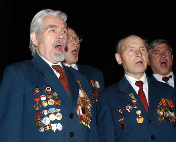 2003年6月22日,佩帶勛章的紅軍老戰(zhàn)士在俄羅斯首都莫斯科勝利公園的衛(wèi)國戰(zhàn)爭紀(jì)念館內(nèi)演唱當(dāng)年的戰(zhàn)歌。當(dāng)天是蘇聯(lián)衛(wèi)國戰(zhàn)爭開始62周年紀(jì)念日。新華社記者 張維革/攝 |