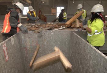 工人在位于美國(guó)加利福尼亞州舊金山市的廢物回收處理公司將混雜在建筑垃圾中的木料揀選出來(lái)。新華社記者 戚恒
