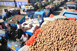 出售馬鈴薯的車隊(duì)排成長(zhǎng)龍。本報(bào)記者