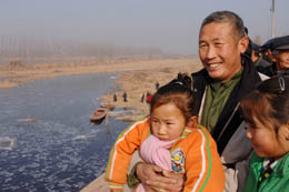 12月9日,在“引黃濟(jì)淀”黃河水入淀現(xiàn)場(chǎng),任丘市大樹(shù)留莊村民李玉山帶著孫女觀(guān)看黃河水入淀。