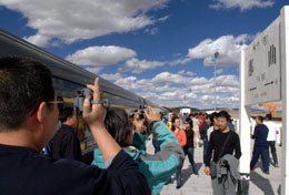 乘火車(chē)進(jìn)藏的旅客在那曲車(chē)站拍照留念。本報(bào)記者 唐召明 攝 |