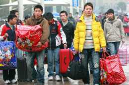 近日,幾名外來務(wù)工者結(jié)伴趕往蘇州 火車站,提前回安徽老家過年。本報(bào)記者:王建中