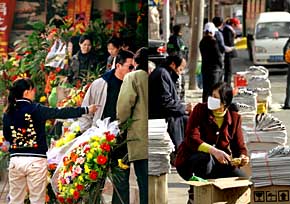 銀川市近日迎來首個(gè)祭奠高峰,到鮮花店選購(gòu)花卉的市民門庭若市(左),而與之一街相隔的紙燭攤點(diǎn)少有問津。本報(bào)記者