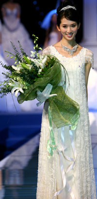 近日,在2007中國(guó)國(guó)際婚博會(huì)上,名模林志玲在某婚紗品牌發(fā)布會(huì)上亮相。盡管婚博會(huì)上的國(guó)際王牌婚紗令人驚艷,但更多的待婚族期待的是一場(chǎng)與眾不同的婚禮。本報(bào)記者:李明放