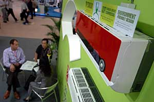 4月19日,客商在廣交會出口展館一家中國家電企業(yè)的綠色環(huán)?照{(diào)展臺洽談。在4月15日開幕的第101屆廣交會上,中國家電企業(yè)推出一批綠色節(jié)能環(huán)保型家電產(chǎn)品,積極應(yīng)對歐盟頒布的第三代綠色壁壘——“耗能產(chǎn)品環(huán)保設(shè)計”指令。新華社記者