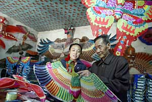 已過耳順之年的潘伯華說,自己扎制風(fēng)箏是自學(xué)成才。工作以后,因?yàn)轱L(fēng)箏扎得好,在市里的比賽中拿了不少獎,1993年前后就開始專做風(fēng)箏生意了。經(jīng)過十幾年的發(fā)展,他的風(fēng)箏生意做得很紅火。潘伯華告訴我們,他的兒子已經(jīng)在法國定居,主要負(fù)責(zé)與國外的風(fēng)箏貿(mào)易,每個(gè)月都能發(fā)出一集裝箱的風(fēng)箏到世界各地!巴鈬藢χ袊膫鹘y(tǒng)風(fēng)箏非常著迷,認(rèn)為風(fēng)箏是極富有中國特色的工藝品。一個(gè)龍頭蜈蚣風(fēng)箏在法國的價(jià)格是國內(nèi)的十幾倍,甚至幾十倍!