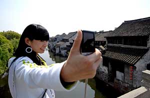 一名游客在江南古鎮(zhèn)西塘體驗(yàn)浙江經(jīng)濟(jì)發(fā)展帶來的新風(fēng)貌。本報(bào)記者 王小川