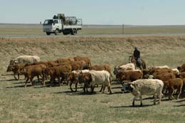 在我國西北地區(qū),公路的扶貧意義遠遠大于中東部地區(qū)。圖為在內(nèi)蒙古蘇尼特右旗境內(nèi)的一條公路旁,牛群在汽車的引領(lǐng)下走向新的牧場。(本報資料照片) | 由于地方財政普遍拮據(jù),資金壓力大、融資渠道單一成為西北交通建設(shè)的瓶頸和桎梏。自去年以來,國家開發(fā)銀行在西北嘗試銀團貸款,這一模式的推廣,讓屢屢為融資而絞盡腦汁的西北交通建設(shè)部門感到欣喜不已。