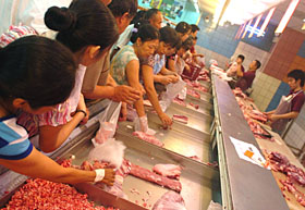 近日來,由于豬肉批發(fā)價上漲,重慶豬肉價格一路攀高,超市特價豬瘦肉賣到了每500克12.8元,眼下不單農(nóng)貿(mào)市場肉價漲聲一片,該市多數(shù)超市已上調(diào)豬肉售價。圖為不少市民正在一家超市肉柜前購買豬肉。