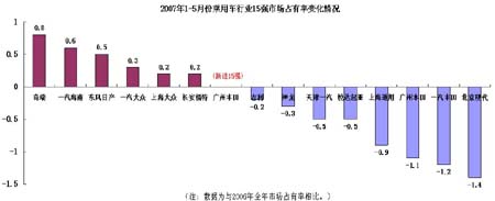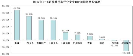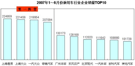 2007年上半年,從乘用車行業(yè)十五強的市場占有率來看,各企業(yè)的排名正好是“七上八下”,其中,“七上”的企業(yè)根據(jù)業(yè)績排名分別為:奇瑞、一汽海南、東風日產(chǎn)、一汽大眾、上海大眾、長安福特和廣州豐田;“八下”的企業(yè)分別是:吉利、神龍、天津一汽、悅達起亞、上海通用、廣州本田、一汽豐田和北京現(xiàn)代。 十五強企業(yè)的“七上八下”也使上半年車市平穩(wěn)發(fā)展的環(huán)境下出現(xiàn)了“幾家歡喜幾家愁”的局面。