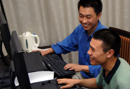 8月23日,在西安市一家賓館內(nèi),楊濤(左)和同伴一起為全國殘疾人技能競賽做準備。 31歲的楊濤目前在自己的家鄉(xiāng)陜西省吳起縣教育局擔(dān)任網(wǎng)絡(luò)管理員。10年前,聽不清聲音的他被確診為神經(jīng)性耳聾,楊濤隨后開始自學(xué)電腦,并通過網(wǎng)絡(luò)在西安市高新區(qū)找到一份工作。在高新區(qū)的工作激發(fā)了楊濤的學(xué)習(xí)與工作潛力,他漸漸成為公司的技術(shù)骨干,并經(jīng)常在網(wǎng)上幫助微軟解決技術(shù)難題。2004年起,楊濤連續(xù)四年被微軟總部授予“微軟最有價值專家”(簡稱MVP)。 |