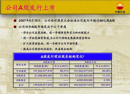 北京股民王先生在獲悉中石油發(fā)布中報的消息后,便開始四處打探這家能源巨頭回歸A股的具體日程,并通過這份中報分析中石油未來在國內(nèi)證券市場的表現(xiàn)。 據(jù)了解,2007年8月10日,中石油召開臨時股東大會,表決通過董事會關(guān)于建議公開發(fā)行A股的決議。根據(jù)公告,中國石油將申請配發(fā)及發(fā)行不超過40億股A股。中石油已經(jīng)向監(jiān)管部門提交了招股文件的草案,計劃在今年9月份招股,預(yù)計A股定價在10元附近。中石油A股承銷團已敲定中金、中信證券和瑞銀。 “長期以來,中石油這么好的紅籌公司遠走海外,這一直是國內(nèi)資本市場的一大缺憾!蓖跸壬f,“如今中石油回歸A股步伐加快,未來一定會有不錯的市場表現(xiàn),我和我的很多股友都很關(guān)注中石油業(yè)績,希望能借機分享到石油公司業(yè)績增長帶來的高收益。” 實際上,關(guān)注中石油回歸國內(nèi)證券市場的投資者不在少數(shù)。而且絕大多數(shù)投資者對中石油的發(fā)展信心十足,并對其在A股市場的投資回報充滿期待。 中石油有關(guān)人士在接受記者采訪時表示,中石油回歸A股符合公司發(fā)展戰(zhàn)略,一方面將拓寬融資渠道,為公司可持續(xù)發(fā)展提供資金支持;另一方面還將提高公司股份流通性,改善股本結(jié)構(gòu),并進一步增強競爭實力和回報能力。 據(jù)了解,中國石油發(fā)行40億股A股后,股份總數(shù)由1790.21億股增至1830.21億股。中油集團所持的國有股本將由原來的88.21%下降為86.29%,而H股占總股本將由原來的11.79%,攤薄至11.53%。 |