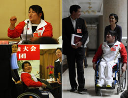 左上:這是邊建欣在分團(tuán)討論會(huì)上發(fā)言。左下:邊建欣在工作人員的幫助下來(lái)往于住處和會(huì)場(chǎng)之間。右圖:討論結(jié)束后,坐在輪椅上的邊建欣和代表邊走邊聊。
