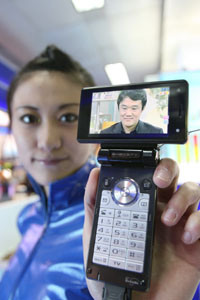2007中國(guó)國(guó)際通信設(shè)備技術(shù)展覽會(huì)上,工作人員展示一種可接收、存儲(chǔ)電視節(jié)目的手機(jī)。新華社發(fā)(陳曉根