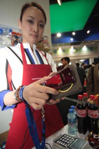 2007中國(guó)國(guó)際通信設(shè)備技術(shù)展覽會(huì)上,工作人員展示“刷手機(jī)消費(fèi)系統(tǒng)”。顧客只要用裝有特殊芯片的手機(jī)在該系統(tǒng)上刷一下,就可完成購(gòu)物支付過(guò)程。新華社發(fā) | 為期四天的2007中國(guó)國(guó)際通信設(shè)備技術(shù)展覽會(huì)日前在北京落下帷幕。作為今年亞洲規(guī)模最大的信息通信展,它已經(jīng)成為運(yùn)營(yíng)商、技術(shù)和設(shè)備供應(yīng)商、系統(tǒng)集成商、終端制造商、互聯(lián)網(wǎng)服務(wù)及內(nèi)容提供商、媒體、分銷(xiāo)商和廣大消費(fèi)者等共同分享的通信大餐,而展會(huì)中展出的一大批獨(dú)具看點(diǎn)的通信產(chǎn)品也成為本次展會(huì)的視覺(jué)盛宴。