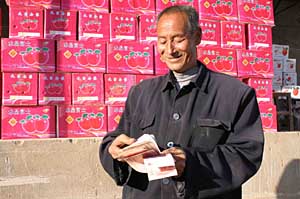 陜西洛川縣槐柏鎮(zhèn)度谷村果農(nóng)清點(diǎn)領(lǐng)到的保險(xiǎn)賠款。新華社記者 張軍