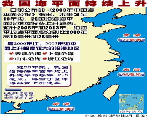 國家海洋局發(fā)展戰(zhàn)略研究所高級工程師鄭淑英告訴記者,近50年來,我國沿海海平面以每年2.5毫米的速率上升,高于全球海平面上升速率的40%。 “2006年,我國沿海海平面比常年平均海平面高71毫米,預(yù)計2016年,我國沿海海平面將比2006年上升31毫米!编嵤缬⒄f,海平面上升將直接引發(fā)風(fēng)暴潮災(zāi)發(fā)生的頻率增大,災(zāi)害強度加大,同時加重海水倒灌、海岸侵蝕等災(zāi)害影響,直接導(dǎo)致沿岸陸地被淹、海島面積縮小。