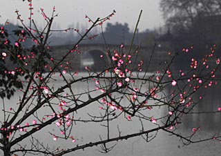 | 西湖風景區(qū)內的盛開的紅梅吸引了眾多游客前去觀賞。新華社記者 徐昱